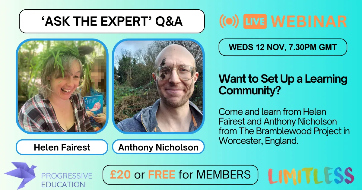 This webinar series is brought to you by Jo Symes at Progressive Education and Alex O’Neill from Limitless. We are education activists who have a shared passion for raising awareness of alternatives to mainstream school.