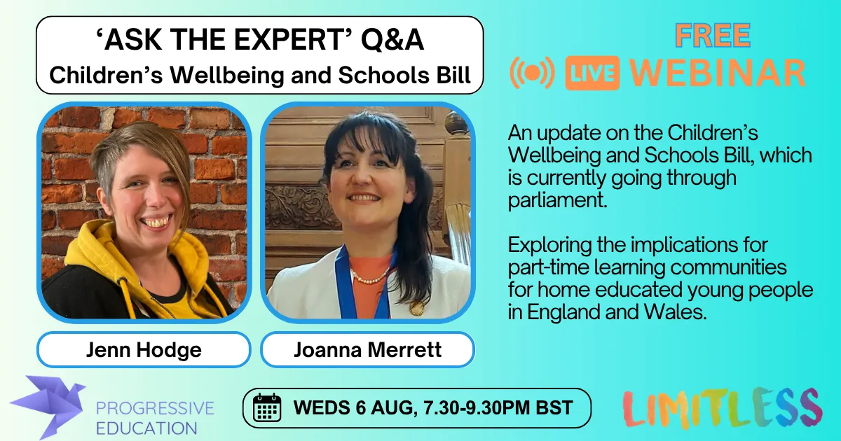 This webinar series is brought to you by Jo Symes at Progressive Education and Alex O’Neill from Limitless. We are education activists who have a shared passion for raising awareness of alternatives to mainstream school.